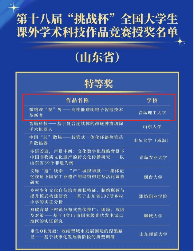 10月30日,第十八届“挑战杯”全国大学生课外学术科技作品竞赛在贵州大学落下帷幕,经过激烈角逐,机械与汽车工程学院参赛项目《微纳观“视”界——高性能透明电子智造技术革新者》(指导教师:朱晓阳、兰红波、杨建军;团队成员:王瑞、周君仪、段培开、张友超、商帅、台玉平、于志浩、张金宝)勇夺主体赛全国特等奖,创造了我院在此项竞赛中首次获特等奖记录。此项成绩也是304永利集团在“挑战杯”系列竞赛中的最好成绩,实现了赛事重大突破。