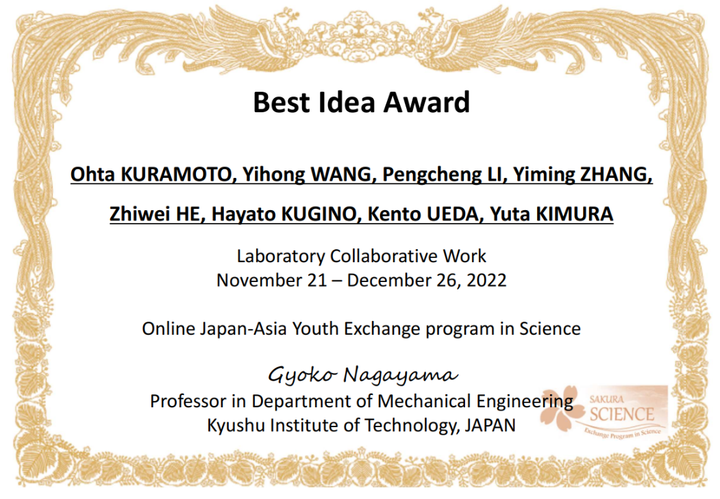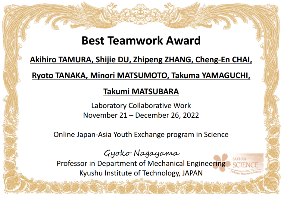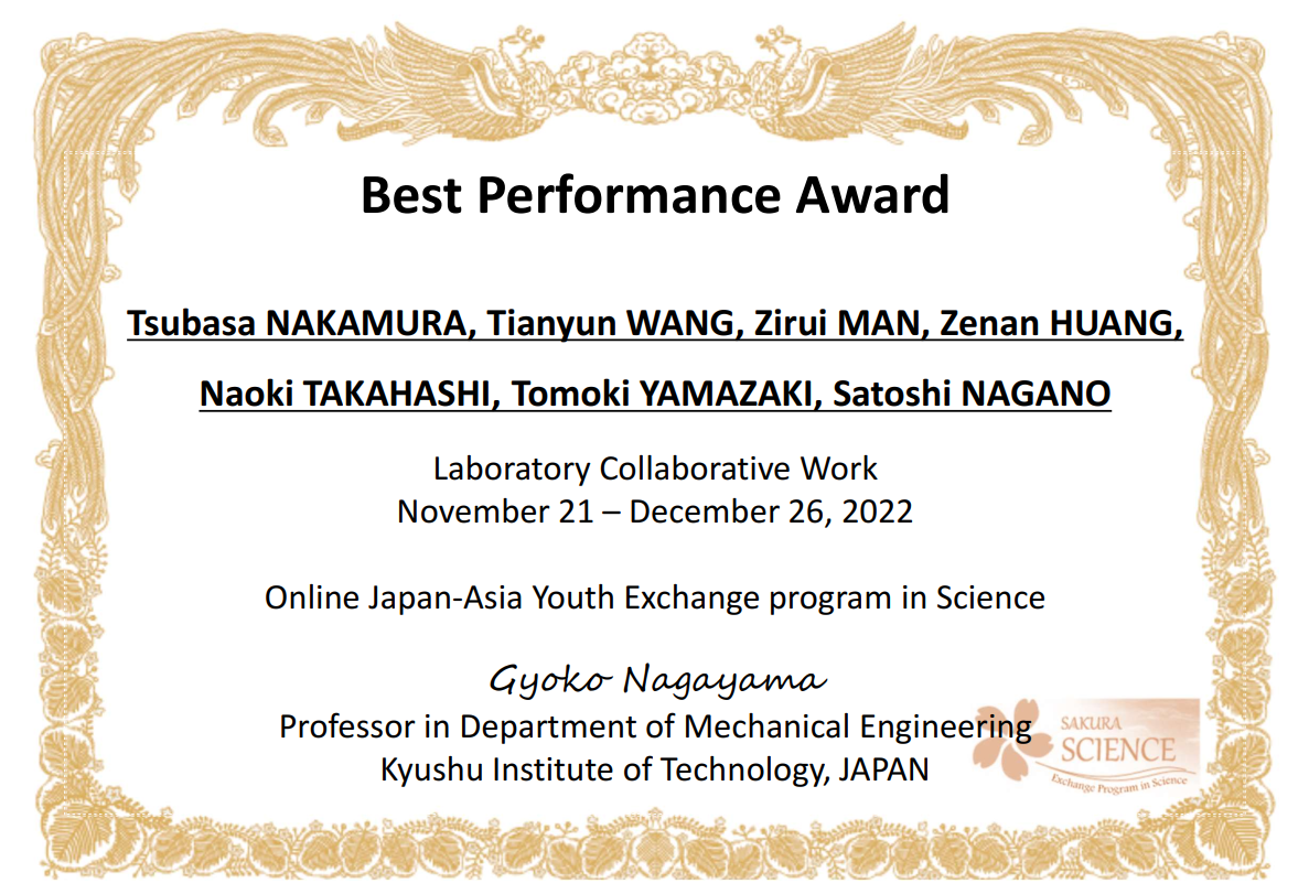 依托机械与汽车工程学院郭峰教授和日本九州工业大学工学部机械工程系长山晓子教授申报的日本科学技术振兴机构(JST)“樱花科技计划”项目,2022年11月14日-12月26日,机械与汽车工程学院共计9名师生参加了为期一个半月的樱花计划线上学术交流活动。本次活动的目的在于促进青年师生间的国际交流合作。参加单位包含日本九州工业大学、304永利集团、东北大学、山东大学、齐鲁工业大学、台湾科技大学及韩国蔚山大学。本次交流活动主要包含学术报告、实验室线上参观及协作项目三部分。