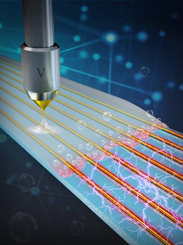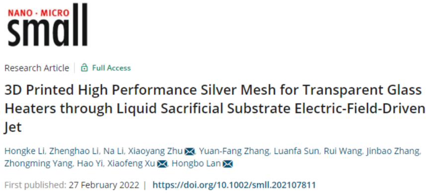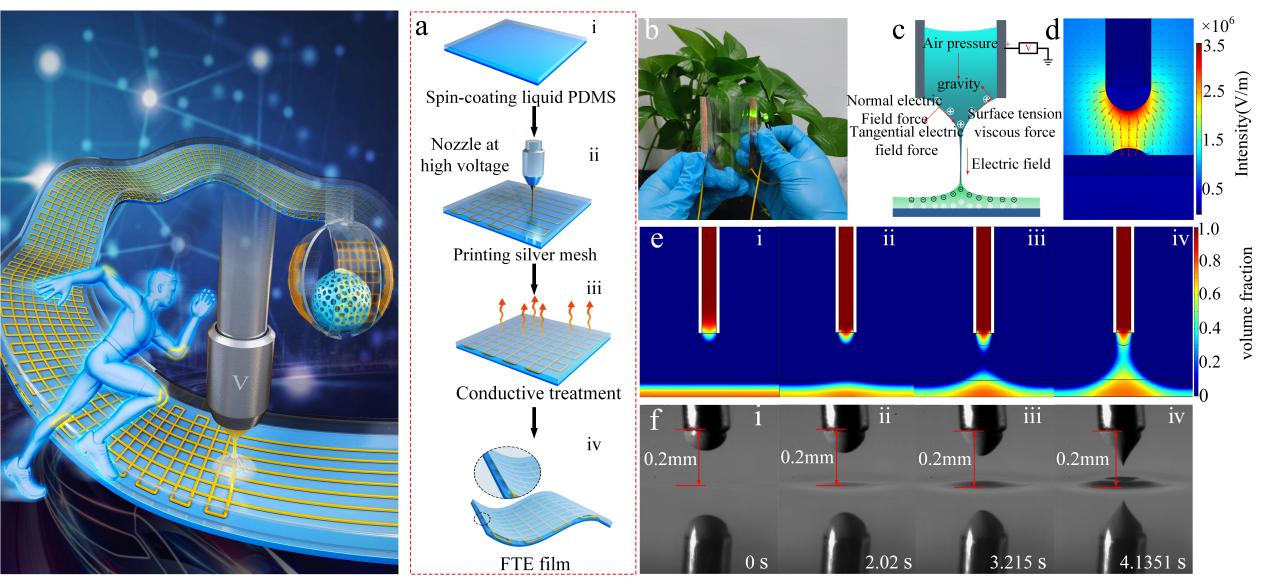 该系列研究成果聚焦于电场驱动喷射微纳3D打印技术及其在高性能透明电极制造中的应用研究:将电场驱动喷射微纳3D打印基底扩展至液态基底,研究了“双锥形”电场驱动喷射现象及液膜对打印材料“限制性”铺展作用,解决了厚膜导电浆料难以直接高分辨率印刷出可观高宽比金属网格、嵌入式金属网格透明电极难以直接打印成型等难题。同时,分别设计并制造了透明电加热玻璃、集成电热及光热的界面热蒸发器、电热驱动型透明4D打印结构、以及人体可穿戴的透明应变传感器,充分展示了所制造刚性及柔性金属网格透明电极的广泛应用潜能。