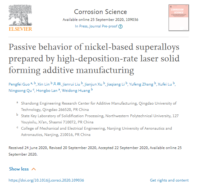我院青年教师郭鹏飞博士联合西北工业大学黄卫东教授、林鑫教授团队和南京航空航天大学曲宁松教授团队,开展了航空发动机用镍基高温合金典型牌号Inconel 718合金(国内牌号为GH4169)的高沉积速率激光立体成形实验。基于激光熔池形貌及温度场数值模拟,揭示了高沉积速率条件下沉积态组织织构的演化规律;通过观察钝化膜的原子尺度结构、成分特征,利用点缺陷模型(Point Defect Model)理论,阐明了钝化膜诱导沉积态试样电化学活性各向同性的作用机理。相关成果以题为“Passive behavior of nickel-based superalloys prepared by high-deposition-rate laser solid forming additive manufacturing”的论文发表在材料腐蚀领域顶级期刊《Corrosion Science》上。论文链接:https://doi.org/10.1016/j.corsci.2020.109036。论文第一作者为我校机械与汽车工程学院郭鹏飞副教授,第一署名单位为304永利集团山东省增材制造工程技术研究中心。该研究得到了科技部国家重点研发计划项目(No. 2018YFB1105901)的支持。