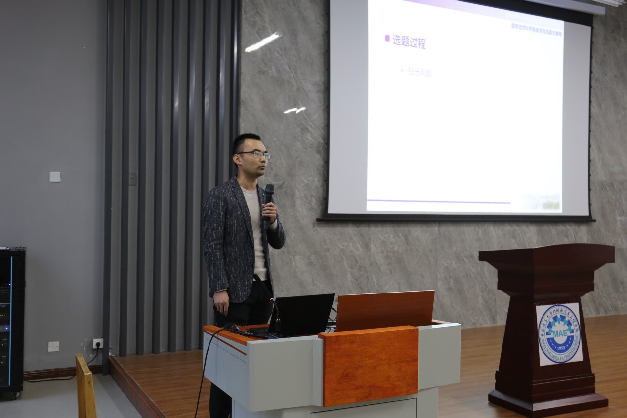 会议分别邀请了机械与汽车工程学院郭峰教授、青年教师侯章浩副教授做了国家自然科学基金申报的经验交流报告,两位老师从申报基金的意义、基金选题、撰写等方面分享了各自的经验和体会,特别是从国家基金科学精神、创新性、科学性、可行性、连续性等方面分析了撰写过程中的技巧和注意事项。