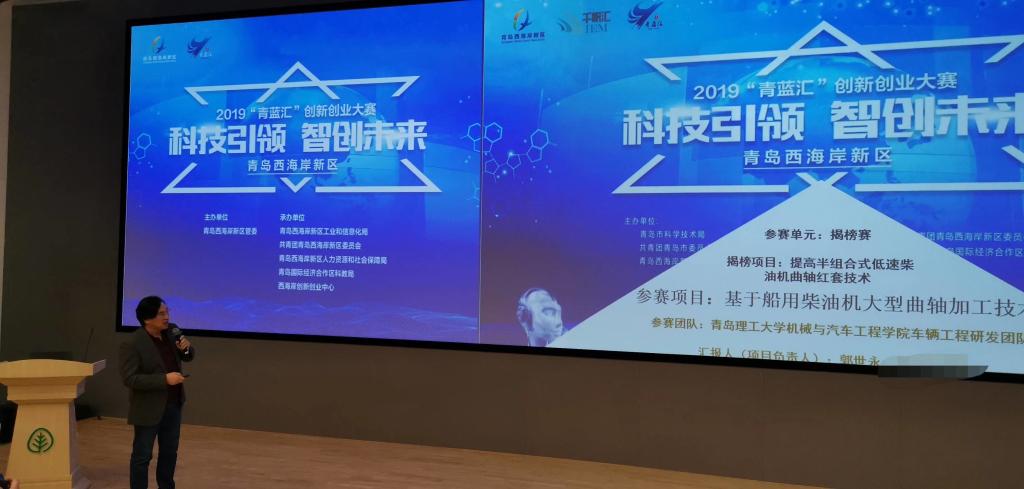 2019年12月24日青岛西海岸新区2019年“青蓝汇”创新创业大赛在青岛国际经济合作区(中德生态园)被动房技术体验中心圆满收官。我校机械与汽车工程学院车辆工程研发团队参赛项目《基于船用柴油机大型曲轴加工技术》荣获获一等奖。本次进入揭榜赛决赛的两只队伍分别是我校机械与汽车工程学院团队和青岛科技大学机电工程学院团队。