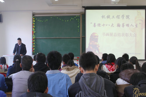 11月14日中午,机械学院“喜迎十八大,翰墨颂人生”书画展总结表彰大会在嘉陵江路校区主教学楼B228举行。学院团总支副书记化磊老师为获奖同学颁奖。本次书画展由学院团总支主办,学院学生会宣传部承办。