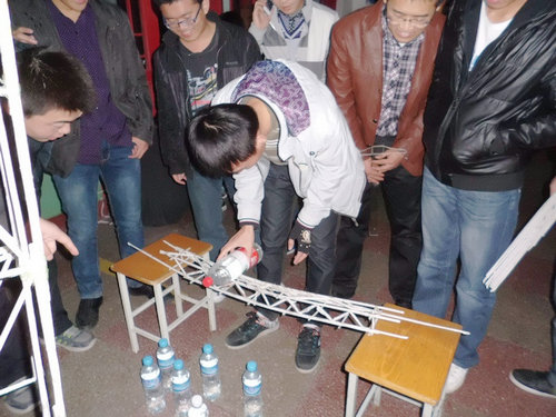 主持人宣布比赛规则及流程:选手需在两张相距80厘米的桌子间搭一纸桥,要求能使装水的矿泉水瓶顺利通过纸桥,并可以承受一定载重(以水瓶数量为测量基准),比赛以三人为一小组,合作完成纸桥的制作和载重测试,每组有三次失败机会,没有尝试;比赛开始,参赛同学各自拿出自己设计的作品,准备一决高下,来自机械103的“文宾桥”体积最大,载重也不负众望,拿到了九瓶水的好成绩。机械107班的“公路铁路两用桥”也不甘落后,以八瓶水的载重居于第二。比赛期间来自测控101的同学为大家现场制作了一座“现场直播桥”,虽然时间仓促,却也成绩斐然,拿到了七瓶水的好成绩;最后,大赛决出了“最佳创意”、“最强结构”和“最佳合作”等合作小组。