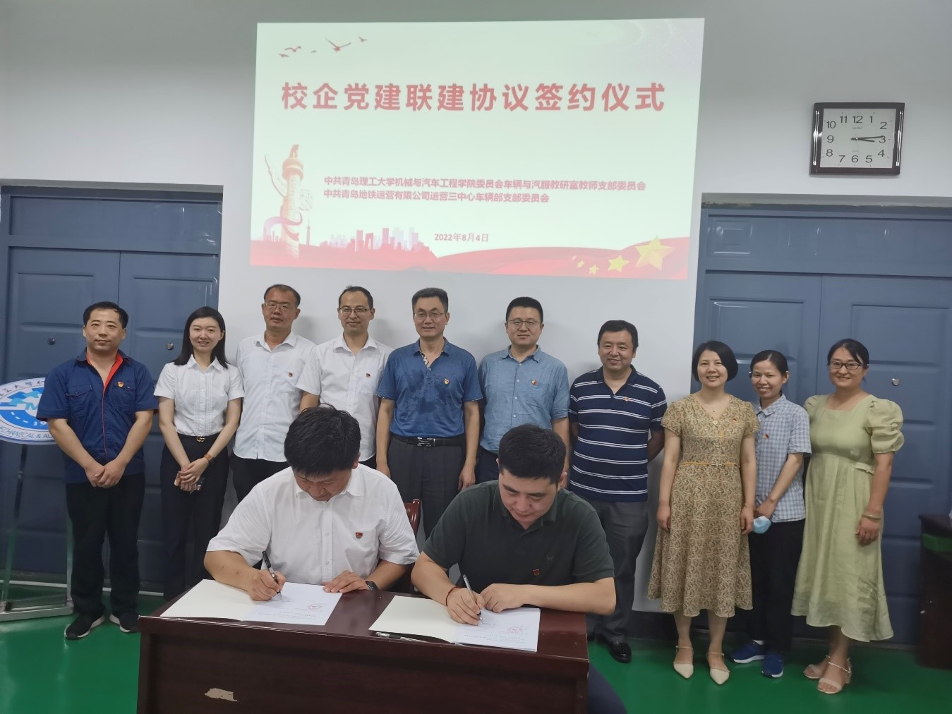 为深入落实新时代党的建设总要求,充分发挥基层党支部的主体作用,激发党员活力,实现党建引领,促进校企合作、产学合作、融合发展,8月4日下午,机械与汽车工程学院车辆与汽服教研室教师党支部与青岛地铁运营有限公司运营三中心车辆部党支部在汽车实验楼408会议室举行校企党建共建签约仪式。学院党委书记李忠晓主持仪式。