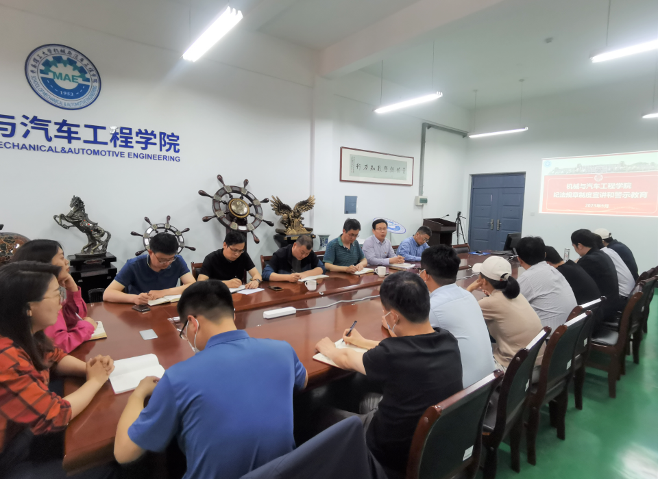 为扎实推进学习贯彻习近平新时代中国特色社会主义思想主题教育,加强党员干部纪法教育和警示教育,按照学校工作部署安排,5月24日下午,机械与汽车工程学院在汽车实验楼408会议室召开规章制度宣讲和警示教育专题会议,学校纪委副书记冯英豪到学院作专题宣讲,学院党委和行政班子成员、党支部书记、副科级及以上干部参加会议。学院党委书记李忠晓主持会议。