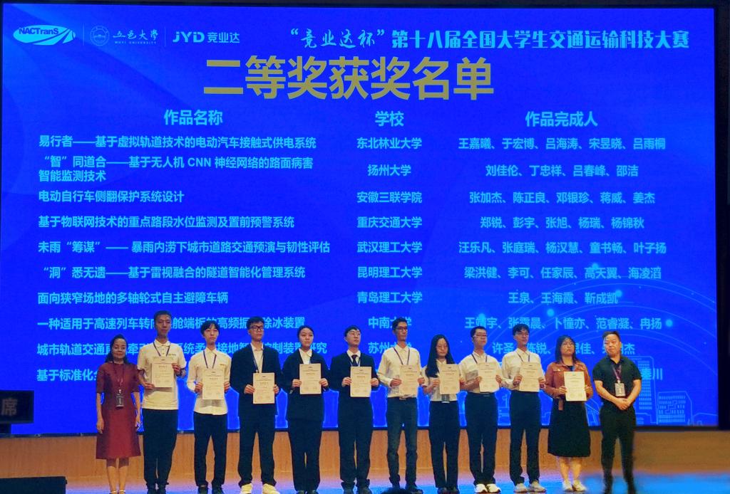 5月27日, 由中国交通教育研究会、中国交通运输协会、教育部高等学校交通运输类专业教学指导委员会主办的“竞业达杯”第十八届全国大学生交通运输科技大赛决赛在五邑大学举行。我校学子共获得二等奖2项,三等奖2项,优秀奖1项。