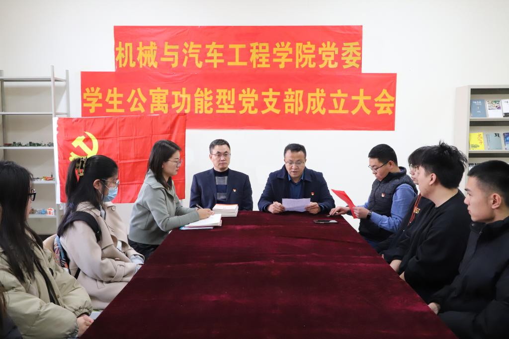 为深入落实“一站式”学生社区综合管理模式的建设,充分发挥党建引领作用,促进学生党员“亮身份、当先锋、树旗帜”,打通公寓党建“最后一公里”,11月23日下午,机械与汽车工程学院党委在西区6公寓318召开学生公寓功能型党支部成立大会。学院党委书记李忠晓、党委副书记董虎,学生公寓功能型党支部书记、新发展党员代表等参加大会。学工办主任、团委书记王成主持会议。