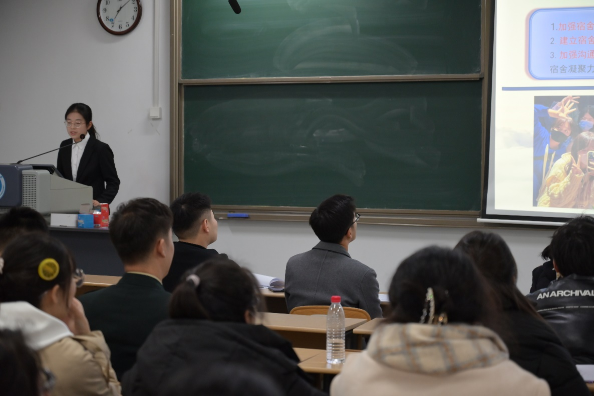 经过前期宿舍申报、班级推荐与材料审核,本次共有15个宿舍成功入围学院答辩环节,由寝室舍长向在场的老师和同学进行了精彩的宿舍风采展示,围绕成员发展、寝室公约、舍风学风、卫生安全状况、团建活动、未来展望等内容,展现出了友爱互助的宿舍氛围、并肩进步的和谐关系和整洁舒心的宿舍环境,展现出了新时代高校公寓的“机车风采”。答辩过程中,各参评寝室特色鲜明,表现突出,为在场的学生观众提供了宿舍管理与集体发展的有益经验。最后张凤波老师就本次答辩选手的表现给予高度评价,对现场选手予以表扬和鼓励。