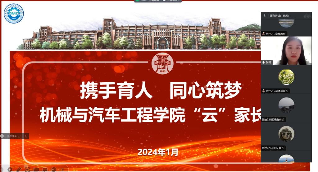 为全面贯彻落实“三全育人”的教育理念,加强与家长的沟通合作,共同推进立德树人根本任务,提升学院人才培养质量。机械与汽车工程学院于1月13日晚19点,召开了一场主题为“携手育人 同心筑梦”的云家长会。学院测控技术与仪器专业负责人官源林,辅导员张翱、代莉、王汉威、测控技术与仪器全体本科生及家长们参加此次线上会议,本次云家长会由张翱主持。