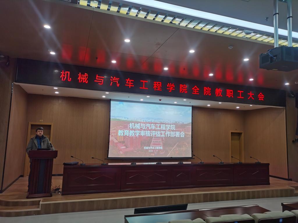 1月17日下午,机械与汽车工程学院在图书馆121会议室召开年度工作总结暨新一轮本科教育教学审核评估全院布置大会。学院党委书记李忠晓、院长郭峰、学院领导班子成员以及学院教职工200余人参加会议,会议由李忠晓主持。