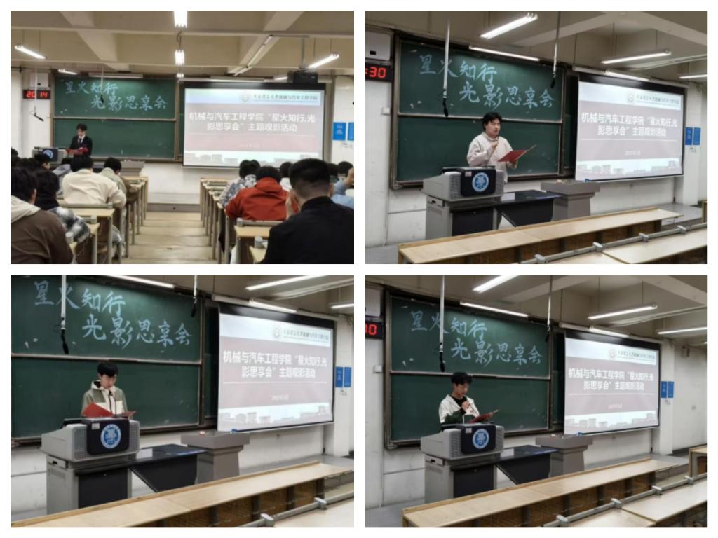 为纪念五四运动106周年,深化爱国主义教育,弘扬五四精神,激发师生的历史使命感,近日,机械与汽车工程学院在主教学楼B216开展“星火知行·光影思享会”主题观影活动。学院团委书记徐卫晓及学院团委、学生会学生骨干、入团积极分子等110余名学生参加。