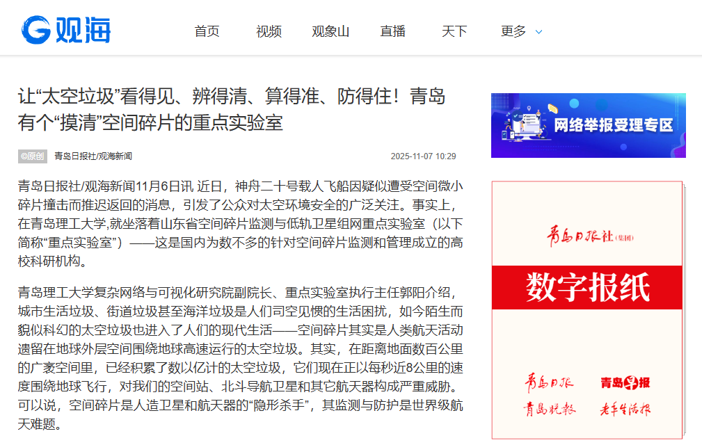 近日,神舟二十号载人飞船因疑似遭受空间微小碎片撞击而推迟返回的消息,引发了公众对太空环境安全的广泛关注。事实上,在304永利集团,就坐落着山东省空间碎片监测与低轨卫星组网重点实验室(以下简称“重点实验室”)——这是国内为数不多的针对空间碎片监测和管理成立的高校科研机构。