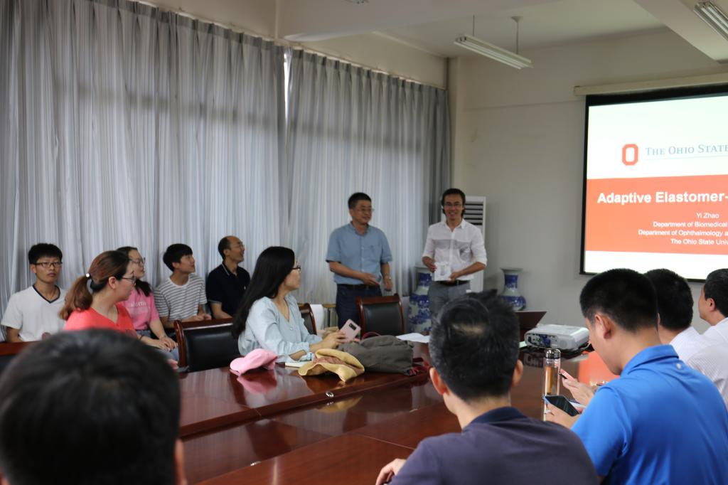 7月12日上午,应我校机械与汽车工程学院彭子龙副教授邀请,美国俄亥俄州立大学( The Ohio State University )工程学院Yi Zhao教授在嘉陵江路校区主教学楼A414做了题为“Adaptive Elastomer-Liquid Lenses”学术报告。郭峰院长主持报告会,副院长王优强、相关专业教师及研究生40余人参加。
